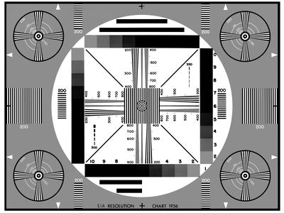 | Для визуальной оценки разрешения ТВЛ применяется испытательная таблица CHART 1956, позволяющая оценить вертикальное и горизонтальное разрешение в пределах до 1600 ТВЛ. При этом изображение испытательной таблицы должно занимать весь кадр исследуемой видеокамеры. | ||||||||||||||||||||||||||||||||||||||||||||||||||||||||||||||||||||||||||||||||||||||||||||||